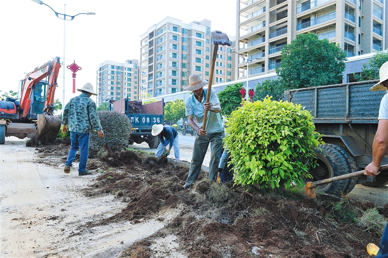 8月23日,临高县城市政道路上,工人们正顶着烈日修整绿化带。洪水过后全县的市政、环卫工人分布在各条道路上进行道路清洁工作,为市民尽早提供整洁的城市环境。