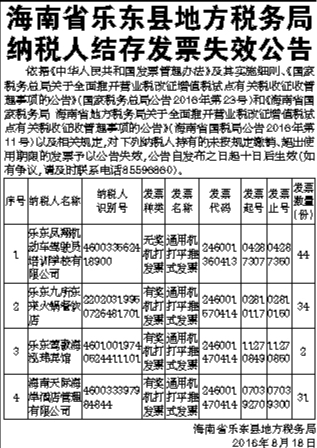 海南省乐东县地方税务局纳税人结存发票失效公告