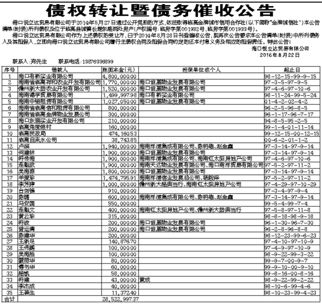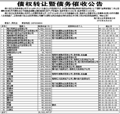 债权转让暨债务催收公告