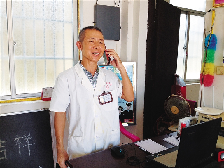 8月15日上午10时,记者来到调楼镇抱社村会卫生室时,陈芝兰正像往常一样忙碌着,除了照看几个输液的病人,还不时拿起电话,叮嘱在家休养的慢性病患者按时按量服药。偶得空闲,他便在电脑桌前坐下,开始浏览微信中的“临高乡村医生”工作群信息,往电脑系统中录入村民健康档案资料。