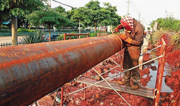 8月24日下午,位于澄迈的海南老城经济开发区内,工人正在焊接在暴雨中损坏的供热管道,确保企业尽快恢复生产,千方百计把损失减少到最低程度。本报记者 李英挺 摄