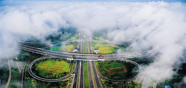 8月24日,海口,云海下的龙昆南延长线立交桥,“美丽海口”四个字镶在云雾之中,仿若仙境。