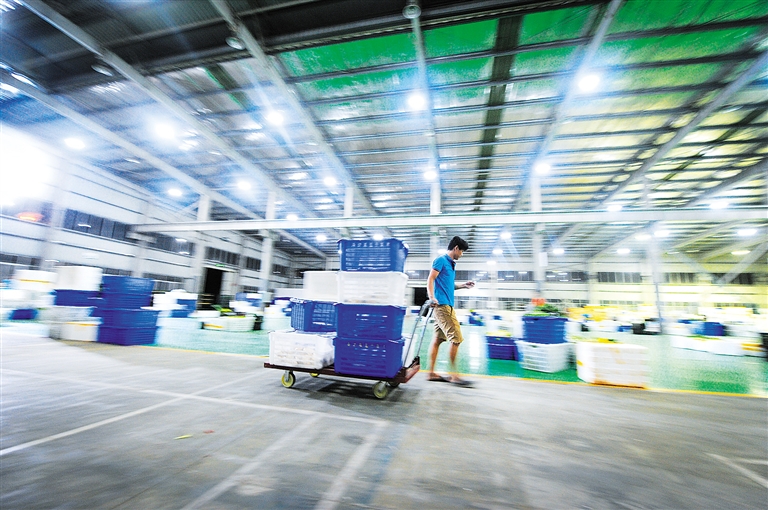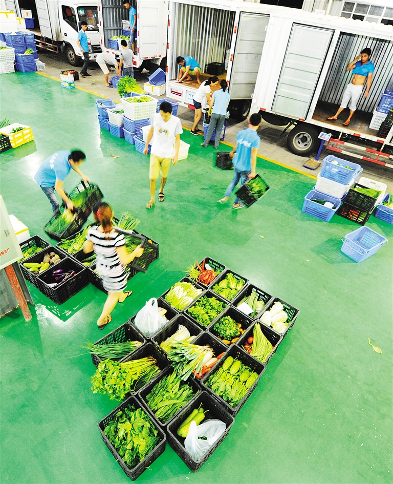 夜深人静之时, 海口市菜篮子1号加工配送中心却一直灯火通明,30多位年轻人正忙着将运来的蔬菜进行检测、分拣。每个人都有自己固定的岗位,负责分拣和包装不同种类的蔬菜,通常从晚上9时到凌晨5时。