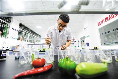 晚上9时,卡车将25吨蔬果运到配送中心,每一种蔬菜都要先进行抽样,然后把样本送进实验室检测农药残留,对采购入库的农产品,实行全品类全批次检测,对存疑的批次实行复检。检测合格的样本将会送至分拣车间。90后王泰华说:“作为检测中心一员,扎根一线,用心确保蔬菜检测合格,对检测不合格的蔬菜第一时间销毁处理,让市民买得放心,吃得安心”。