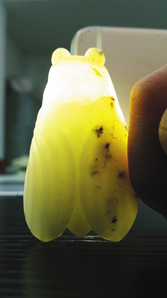 在陈作发的朋友圈里,分别展示了新疆和田羊脂白玉籽料雕琢的宋代玉蝉、文化时期至夏代白玉蝉、春秋时期和田青玉玉蝉等几款玉蝉。其中一款明代玉蝉别具特色。这是一块新疆和田青白雕琢的佩玉,头部有牛鼻孔,寓意着腰“蝉”万贯,玉蝉头部雕琢“富”字,也寓意着富贵吉祥。从雕工来看,其古拙粗犷,时代风格十分明显。“禅在古人心中的地方很高,常用蝉的羽化涅槃比喻人的重生,向来被视为高洁、通灵的象征。‘生以为佩,死以为含’,古人常佩戴蝉型玉佩祈求心灵不灭,涅槃为仙。”陈作发介绍。
