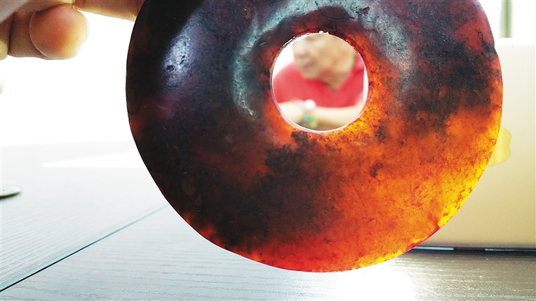 藏品多了,也不是件件都包装得华丽。陈作发的古玉用软纸或碎布包了,叠放在有些陈旧的铁皮盒子里。“这块是红山文化玉璧,直径8.1厘米,孔径2.1厘米,厚0.4厘米,外径不太圆,刃边,型制古拙,典型红山玉璧器型。呈朱砂沁色,自然柔和,玉色为浅绿色,玉质温润。”但为何要设计成刃边,陈作发表示不得而知。