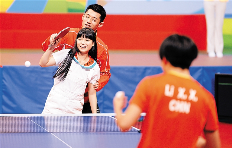 图为乒乓球运动员张继科(后)指导粉丝与李晓霞对决。新华社发