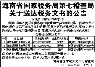 海南省国家税务局第七稽查局关于送达税务文书的公告
