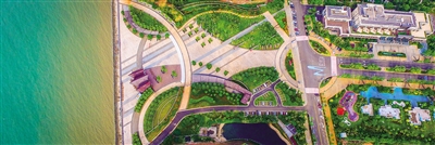随着海甸二西路改造完工、碧海大道和海甸二西路的联通,目前海口市海甸岛初步形成了畅通的环岛道路系统。环岛路的贯通带动了道路两侧的小公园、绿地、漫步道、骑行道等配套项目的建设,与环岛道路一起构成环岛公园体系,成为居住在海甸岛居民休闲旅游、运动健身、假日活动的场地。图为高空俯瞰海甸岛美丽沙音乐广场景观。本报记者 张茂 实习生 吴英艳 摄