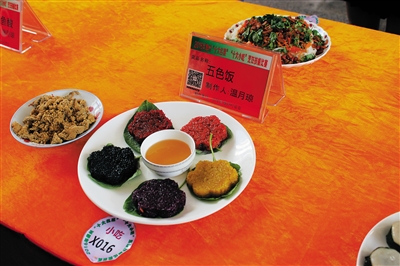 儋州苗族神秘的五色食品,有红、黄、蓝、白、黑五色,用植物汁液作为天然色素拌在米中蒸成,色香味俱佳。