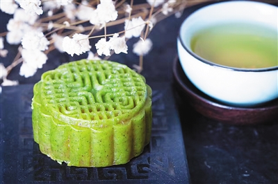 先把鸡屎藤磨成的粉或榨出的汁同酥油和面粉和成面团,将面团揪成小段,塞入莲子或椰子馅和咸蛋黄,揉捻成一个绿色的小面团,月饼的胚体便做好了。将放入模具按压成型,烙上独特的花纹,就可以送入烤箱了。制作好的月饼如同一块碧绿的翡翠,十分讨喜。轻咬一口,鸡屎藤的淡淡清香在唇齿间弥漫,椰蓉香甜和蛋黄的粉糯交杂,舒爽清甜毫无油腻之感。
