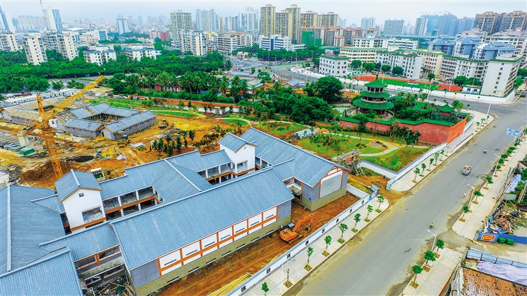 8月29日,在海口市丘海大道,高空鸟瞰海瑞墓修缮扩建工程中的展演中心,目前该中心主体工程已完工,正进入装修阶段。据了解,海瑞墓最近的一次扩建修缮工作是在1996年。此次海瑞墓修缮和扩建将与滨涯村片区旧城改造相结合,规划“一心一园、两轴多区”的功能布局。海瑞墓现用地面积为15亩,扩建后面积为76.22亩,项目总投资约6095.94万元。预计海瑞墓的展演中心、游客中心等扩建工程今年9月底全部竣工。