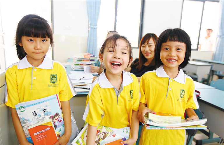 8月30日,海口五源河学校小学一年级新生高兴地领取新课本。目前,该校已竣工验收并交付使用,今年小学一年级共招270人,初中一年级共招400人。本报记者 张茂 实习生 吴英艳 摄