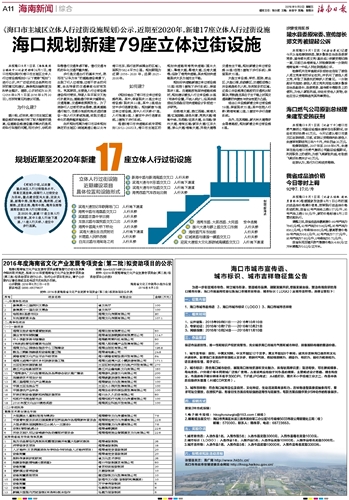 结合公共设施新增立体过街设施19座、保留现状15座;其中包括人行桥(跨海甸溪)2座、1套空中步行连廊系统。