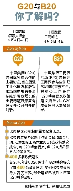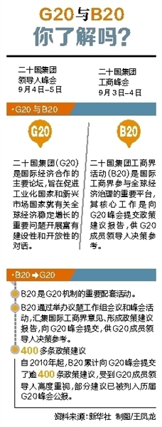 2016年二十国集团工商界活动主席、中国贸促会会长姜增伟1日在G20新闻中心举行的发布会上介绍,每年的B20都组织G20成员工商界代表,围绕世界经济面临的核心挑战和突出问题进行充分研讨,形成共识,编写政策建议报告,并提交给G20峰会,供领导人决策参考。