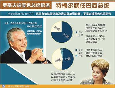 由81名议员组成的巴西参议院当天对总统弹劾案进行表决,结果为61票赞成、20票反对,超过所需三分之二以上票数支持,弹劾案获通过。