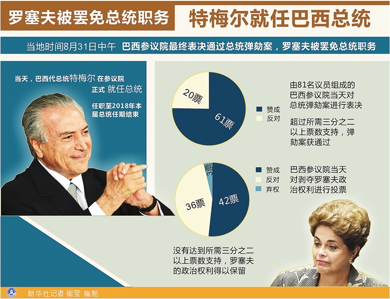 巴西参议院8月31日对剥夺罗塞夫政治权利进行投票,结果为42票赞成、36票反对、3票弃权,由于没有达到所需三分之二以上票数支持,罗塞夫的政治权利得以保留。