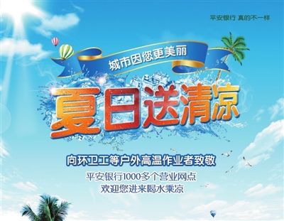 在平安银行营业网点外面,远远就可以看到LED显示屏上滚动播出“城市因您更美丽•夏日送清凉 平安银行向高温户外作业者致敬 欢迎您随时进来歇歇脚、喝喝水”等信息,全国逾千家网点敞开“清凉门”,欢迎户外高温作业者和市民前来歇脚、喝水、乘凉,还精心准备了清凉饮品如花果茶、大麦茶、苦荞茶与防暑药品为他们解渴降暑。