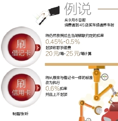 最近,一条消息在汽车经销商的朋友圈里被“刷屏”:9月6日起,刷信用卡购车将收取0.6%的手续费,上不封顶。这意味着,今后市民到汽车4S店购车或修车刷信用卡可能需要多付一笔费用了。