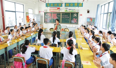 9月1日,海口市玉沙实验学校和海南省军区75576部队共同开展开学典礼暨纪念长征胜利80周年活动。图为部队官兵战士向学生讲解红军长征的历史。本报记者 张茂 摄