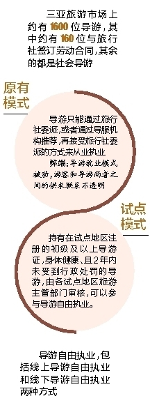 三亚开展线上线下导游自由执业试点工作,意味着今后游客可直接通过网络平台、景区(点)等预约导游服务,无需再经过旅行社这一环,打破了“只有旅行社才能委派导游提供服务”的传统模式。