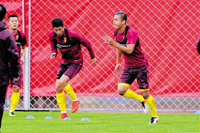 北京时间9月3日,中国国家男足在沈阳冒雨训练,备战即将到来的12强赛主场与伊朗之战。图为小将张玉宁(右)在训练中。小新发