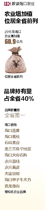 “按照地域划分,海口有东部、南部和西部三大农业黄金板块,这是发展培育农业品牌的优越生态条件。”海口市农业局局长李世高说,今年海口推出的十大农业品牌,就分布在这三大板块之中,“它们不仅是大自然的造化,更是一笔珍贵的历史遗产,蕴藏着巨大的经济、社会和文化价值,海口将通过扩大实施农业品牌化战略,把这些集人文、生态、环境为一体的要素资源整合起来,在农旅融合、互联网+等方面探索出路,使其最终成为助推地方经济发展的重要支柱产业。”