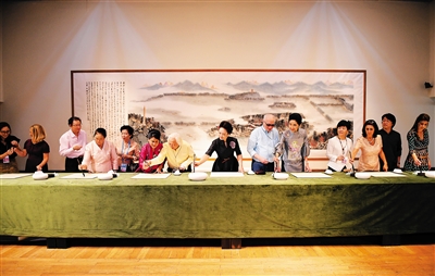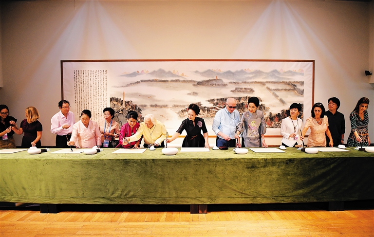 9月5日,国家主席习近平夫人彭丽媛邀请出席二十国集团领导人杭州峰会外方代表团团长夫人参观中国美术学院。这是彭丽媛与来宾一同书写汉字“和”。 新华社记者 谢环驰 摄