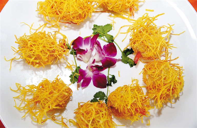 排浦海虾制作者羊裕群说,此菜主要原料是虾肉,口味鲜香,主要工艺是炸,整只虾肉裹着厚厚的土豆丝,看着毛茸茸的金黄色小球,咬在嘴里,一种外酥里嫩的感觉,很适合作为节日的菜肴。