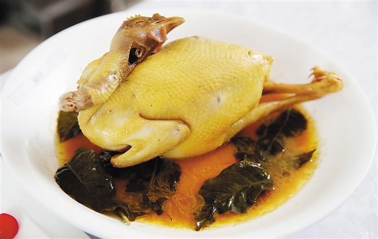 南吉黄皮鸡也称“儋州小种鸡”,属本地土鸡种,在黄皮树下、田野山林间放养,以黄皮叶、黄皮根须、黄皮花、黄皮果、稻谷、玉米、花生饼、青草粉等原料饲养。黄皮鸡是儋州市民间特色美食中不可多得的菜肴,系祖辈们用来招待亲朋好友和贵宾的上等菜肴。制作者透露,南吉黄皮鸡主要以黄皮叶为原料,加配葛根、枸杞子粉等8种名贵中药,经七八道烹饪厨艺程序,慢火蒸熟,内质柔韧、骨脆清香,吃了回味无穷。