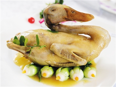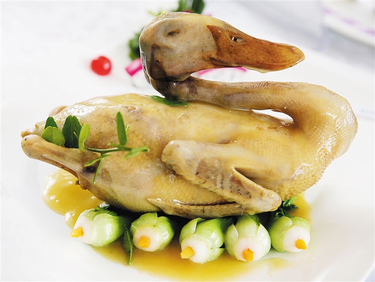 儋州厨师郑造邦,创制了酒饼簕炖海鸭。他介绍,本菜肴就地取材,采用野生长于本店已达30余年的酒饼簕和放养于本店海水池塘的老母鸭为主料。经过炖制使酒饼簕的微辛、微苦之味浸入鸭体,与老鸭的微咸、微甘之味完美结合,口感特别,回味悠长,具有祛风散寒、利水、滋阴养胃之功效。