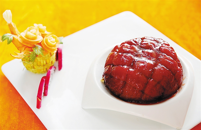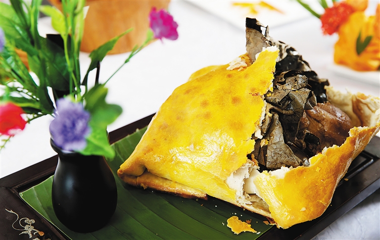 王利波说,为弘扬东坡文化,他结合传统制作方法和现代烹饪技艺,选用儋州本地黑猪前肘、新鲜荷叶和厨师手工制作的酥皮,经过精心秘制,色泽金黄,表皮酥脆,肉质清香可口。