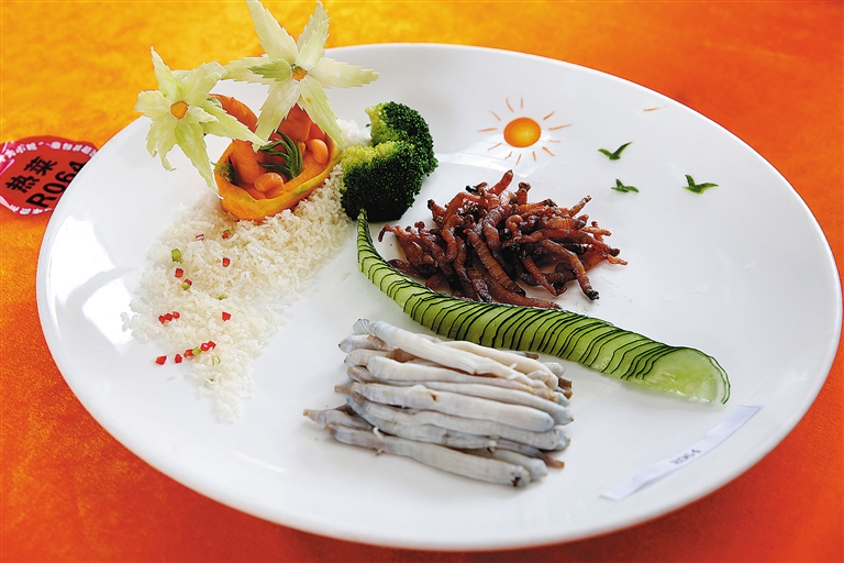 儋州的光村沙虫,又称“海肠子”,学名“方格星虫”,产于沿海滩涂泥沙之中,长两寸左右,状若芦芽。
