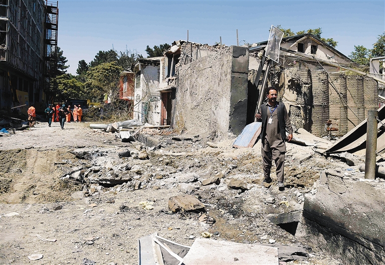 9月6日,在阿富汗喀布尔,安全人员在一家国际援助机构的遭袭现场工作。 据当地媒体报道,一名自杀式袭击者5日晚在喀布尔一处商业区引爆一辆装有炸弹的车辆,随后爆炸地点传出枪声。这是喀布尔当天发生的至少第三起爆炸。当天早些时候,阿国防部附近发生至少两起爆炸,造成至少24人死亡、91人受伤。 新华社/法新