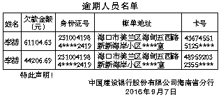 2016年8月25日刊登在《海南日报》B05版的“中国建设银行信用卡逾期欠款催收公告”,第二栏表格的倒数第7行、第8行的姓名发生错误,更正为:“李喆”。具体信息如下表: