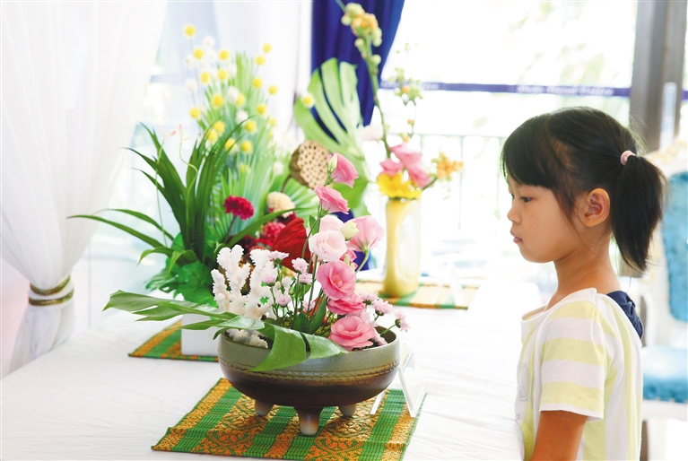 9月3日—9日,第二届花道插花与绘画艺术作品展在海口展出,吸引观者驻足观赏。据了解,本次展览以“弘扬花道文化 传播中国插花”为主题,艺术展首日展出的43幅插花作品中有欧式古典花型和现代花型等,大部分由残障人士倾心创作而成,吸引两岸插花艺术和文创专家现场指导。