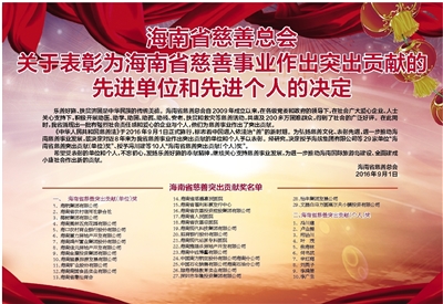 《中华人民共和国慈善法》于2016年9月1日正式施行,标志着中国进入依法治“善”的新时期。为弘扬慈善文化、表彰先进,进一步推动海南慈善事业发展,兹决定对近8年来为我省慈善事业作出突出贡献的单位和个人予以表彰。经研究,决定授予海航集团有限公司等29家单位“海南省慈善突出贡献(单位)奖”、授予冯川建等10人“海南省慈善突出贡献(个人)奖”。