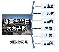 峨蔓古盐田有“六大古韵”:一是古卤池。盐的繁体字为“鹽”,其中的“卤”是制盐过程中必不可少的工序;二是古盐槽,共有7500多个,在全省最多;三是古盐房,现存近40栋,全由火山岩石砌筑而成;四是古道,用火山岩石铺砌而成,现已出现风化的小孔,岁月的沧桑可见一斑;五是古塔,包括细沙灯塔和风水塔;六是古盐神,有一尊巨石,状似人形,被村民奉为盐神。据介绍,过去的盐丁们挑着盐经过此地时,都要放下担子祭拜盐神,以求得到庇佑。