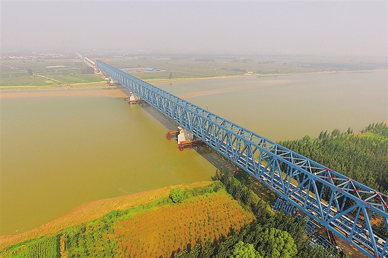 黄大铁路黄河特大桥。当日,黄(骅)大(家洼)铁路黄河特大桥主桥工程全部完工。大桥位于山东省利津县境内,距黄河入海口约110公里,主桥全长960米,为黄大铁路唯一的重难点控制性工程。 新华社记者 邢广利 摄