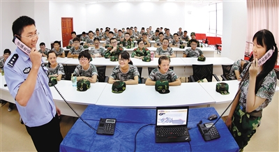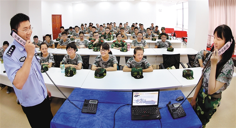 9月8日,民警张志荣(前左)在华东理工大学和大学生通过情景剧表演为刚入学的新生模拟电信诈骗过程。