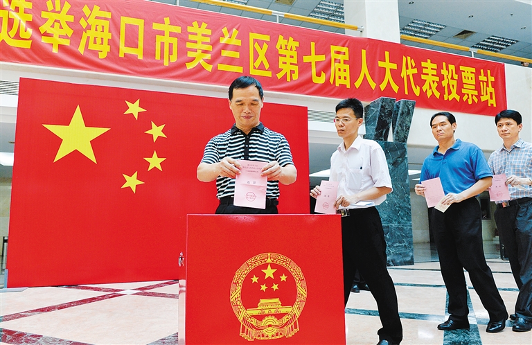 伴随着雄壮的国歌声,上午9时,投票正式开始。选民们首先在选举现场认真听取主持人宣读了《海口市龙华区第七届人民代表大会代表选举办法》和投票纪律。举手对选举办法和监票人、计票人、唱票人等工作人员进行表决,全票表示通过,随后,进入写票、投票程序。