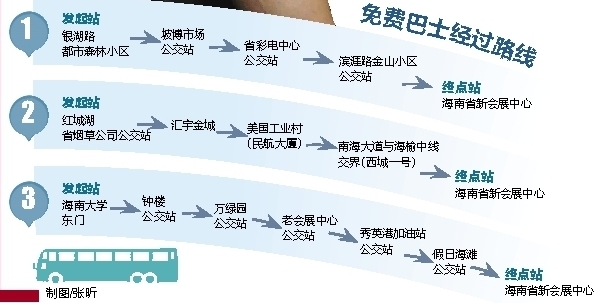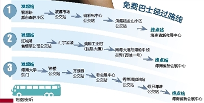 车展期间,组委会租用12辆空调大巴车往返市区和海南国际会展中心,免费接送市民观展。市民可在海口海甸岛海南大学东门、银湖路都市森林小区、红城湖路省烟草公司公交站三个地方乘坐免费的巴士直达车展现场。免费巴士发车时间为首班车早上8时30分,末车时间为17时,每30分钟一趟。