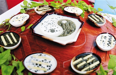 在琼海馆,一盘巨大的八卦阵鸡屎藤吸引了记者的注意,“这是乾,这是坤,这是坎,中间是个太极……”和树银海杂粮甜品的店长李香蓉向记者介绍道,海南人每逢过节都是吃鸡屎藤祈求平安,同时鸡屎藤在《本草纲目》的记载中又有清热、解毒、安神的功效,所以想出了八卦阵鸡屎藤的创意。
