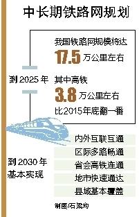 按照最新发布的《中长期铁路网规划》,到2025年,我国铁路网规模将达17.5万公里左右,其中高铁3.8万公里左右,比2015年底翻一番。到2030年,基本实现内外互联互通、区际多路畅通、省会高铁连通、地市快速通达、县域基本覆盖。