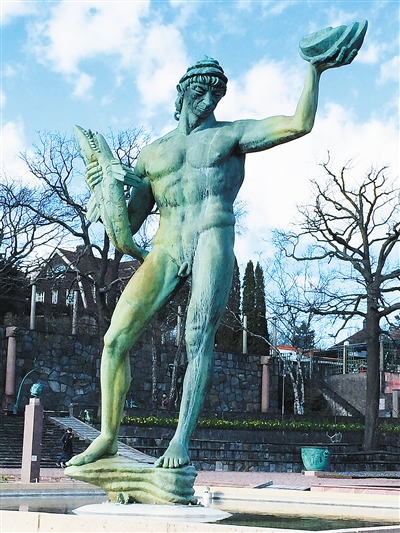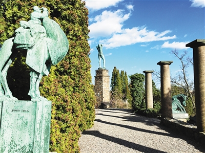 从斯德哥尔摩市区驱车往北20分钟,跨上利丁岛长桥,便可看到长桥尽端的悬崖峭壁上辟出的一个平台,平台之上有一些高高的长柱,柱顶耸立着展翅欲翔、姿态各异的天使雕塑,那儿便是我们的目的地——米勒斯花园。