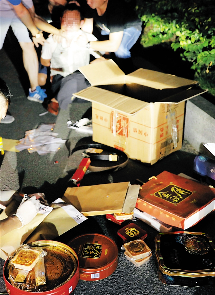 经过1个月的长线经营,9月3日,办案官兵抓住机会,在三亚市某学院附近,成功抓获了携毒返回三亚的黎某,当场缴获用于藏匿毒品的月饼10盒,并从中搜出冰毒、麻古等各类毒品4.114公斤。