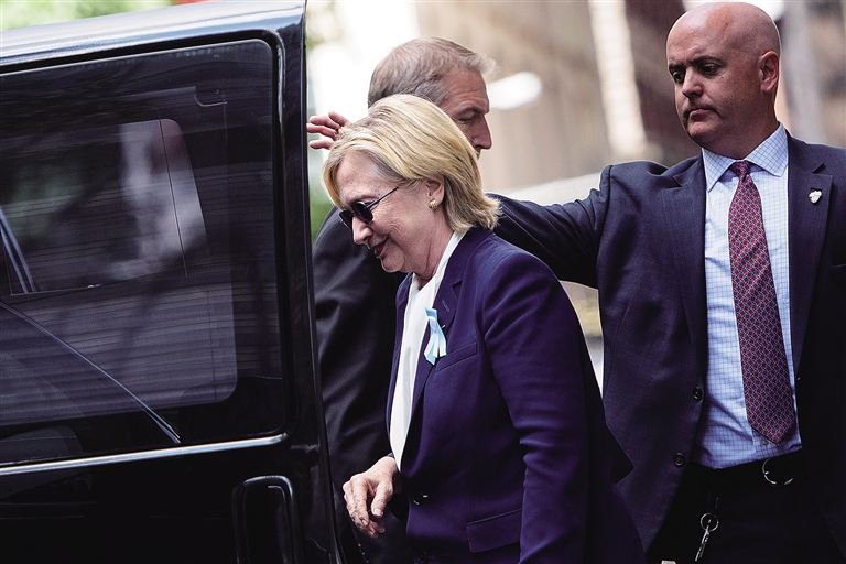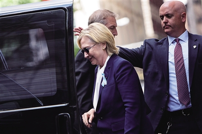 9月11日,希拉里在纽约市参加“9·11”纪念活动时身体不适,被3名随行人员搀扶着提前退场。竞选团队称,希拉里因“天气过热”而呈现脱水症状。她的医生当天晚些时候说,希拉里9日被确诊患上肺炎,正在接受治疗。 新华社/法新