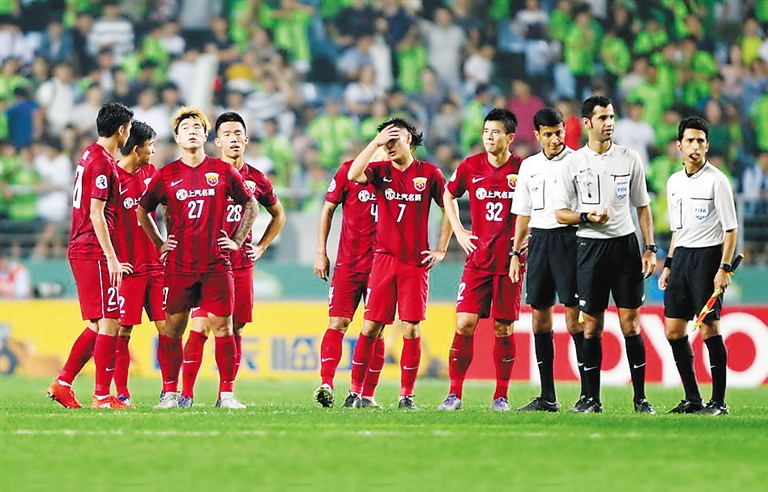 9月13日,在亚冠联赛1/4决赛次回合比赛中,上海上港队客场0:5惨败给韩国全北现代队,两回合总比分0:5无缘四强。图为失落的上港球员。小新发