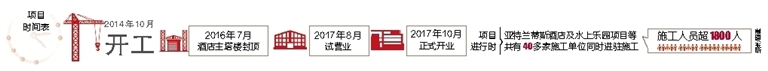 从人员配备上看,亚特兰蒂斯酒店及水上乐园项目等共有40多家施工单位同时进驻施工,其中5家装修单位同时进行客房装修及机电安装工作,涉及人员超过1800人。