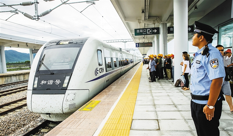 今天上午9点,金月湾站举行了开通运营仪式,广铁集团、东方市有关负责人、附近村庄的100多位村民乘坐首发的D7184次动车从金月湾站前往东方、白马井等站点。